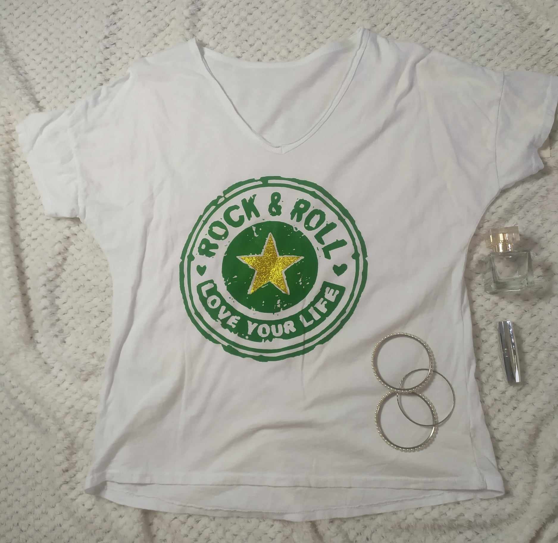 Proponujemy bluzkę w kolorze białym . Z przodu ozdobiona zielonym wzorem. Dekolt jest w serek, rękaw krótki. Rozmiar jest unwersalny, ale wypada na rozmiar L lub XL.