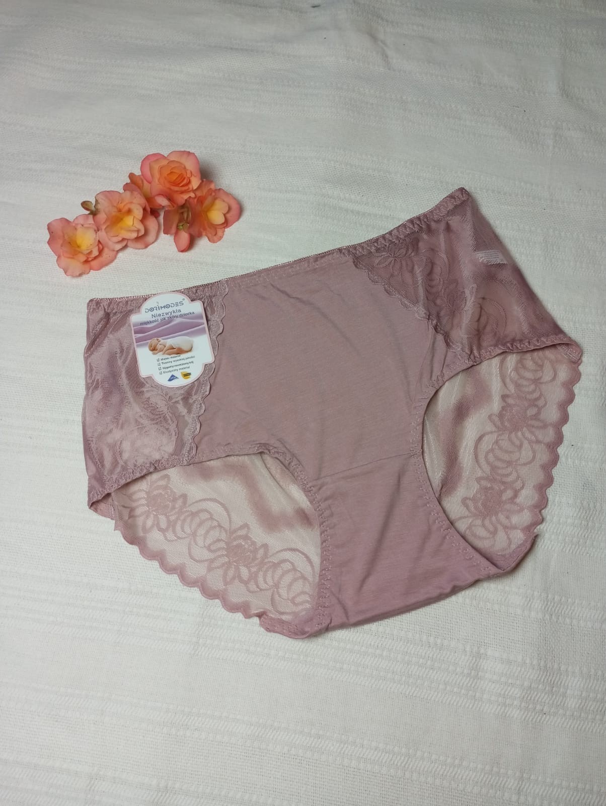 Tanie figi damskie o klasycznym kroju ozdobione elegancką i miękką koronką. Przód damskich fig wykonany jest z viscozy. Po bokach koronka, która przechodzi na pośladki. Figi dopasowują sie do ciała zapewniając przez cały dzień wygodę. Te damskie figi to produkt dla kobiet ceniących naturalne materiały i jakość.