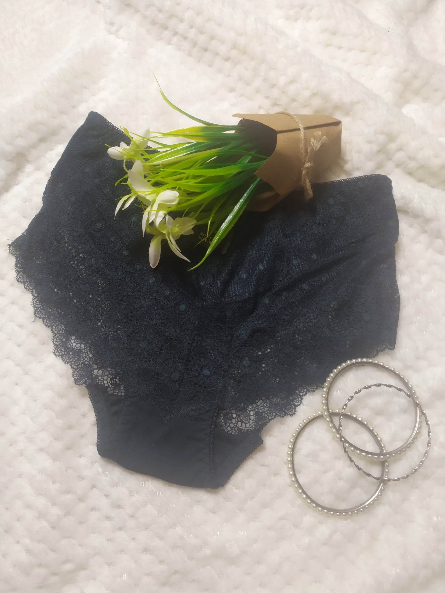 Oferujemy figi o klasycznym kroju w kolorze ciemnej zieleni. Przód majtek jest z koronki. nie podszytej materiałem. Tył jest bawełniany ozdobiony koronką.