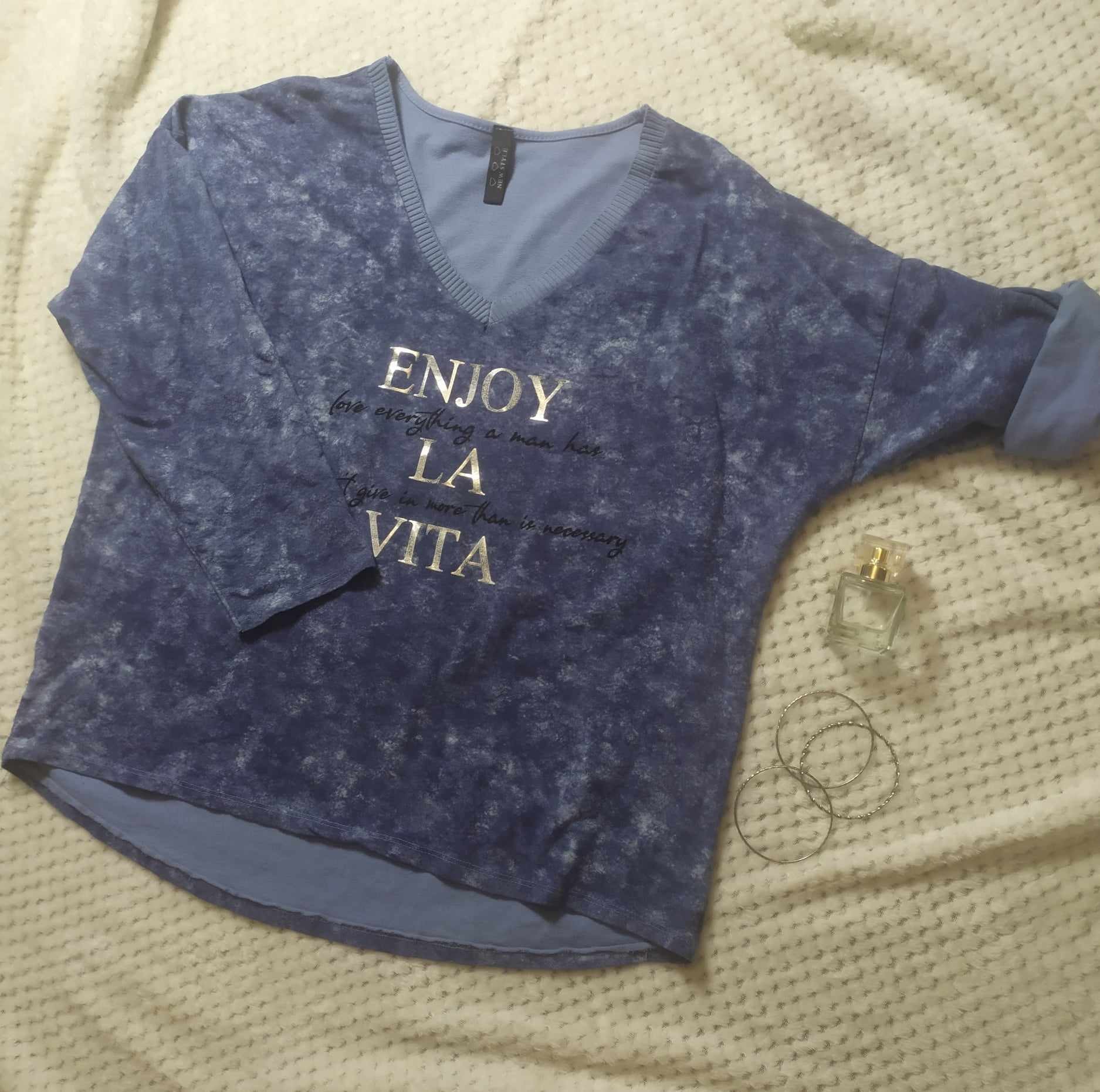 Proponujemy bluzkę w kolorze dżinsowym. Dekolt jest w kształcie serek. Rękaw długi, który możemy nosić podwinięty.Tył bluzki jest trochę dłuższy od przodu co idealnie maskuje niektóre niedoskonałości. Bluzkę możemy ubrać do spodni i do spódnicy.