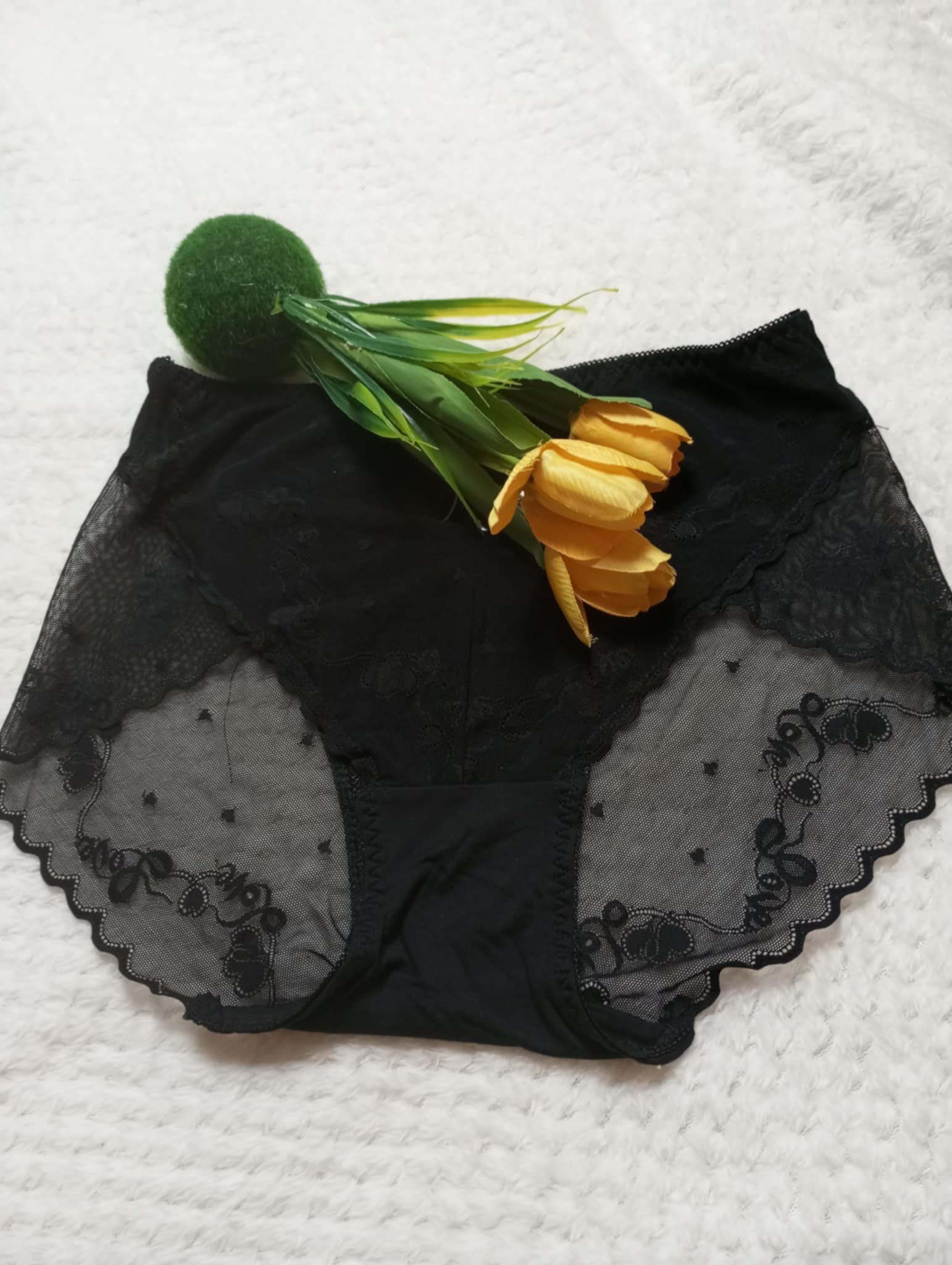 Figi damskie z wyższym stanem. Przód ozdobiony koronką podszytą materiałem. Tył pełen, nie odznaczający się pod lżejszymi ubraniami. Majtki wykonane z delikatnego, miękkiego i przyjemnego dla ciała materiału. Figi lekko ściągają brzuch. Produkt idealny dla osób ceniących jakość i wygodę.