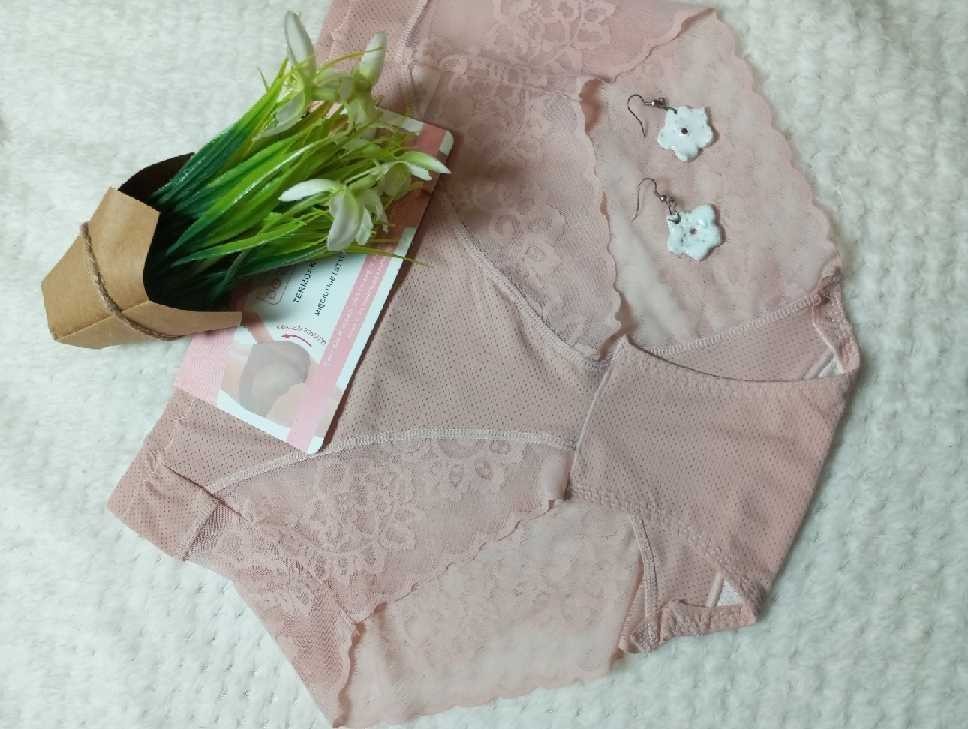 Majtki w kolorze beżowym. Wykonane z delikatnego materiału przylegające do ciała dzięki czemy są niewidoczne pod ubraniem. Wygodne w noszeniu, przód i tył fig wykończony koronką podnoszącą pośladki. Mają wyższy stan siegający pasa.