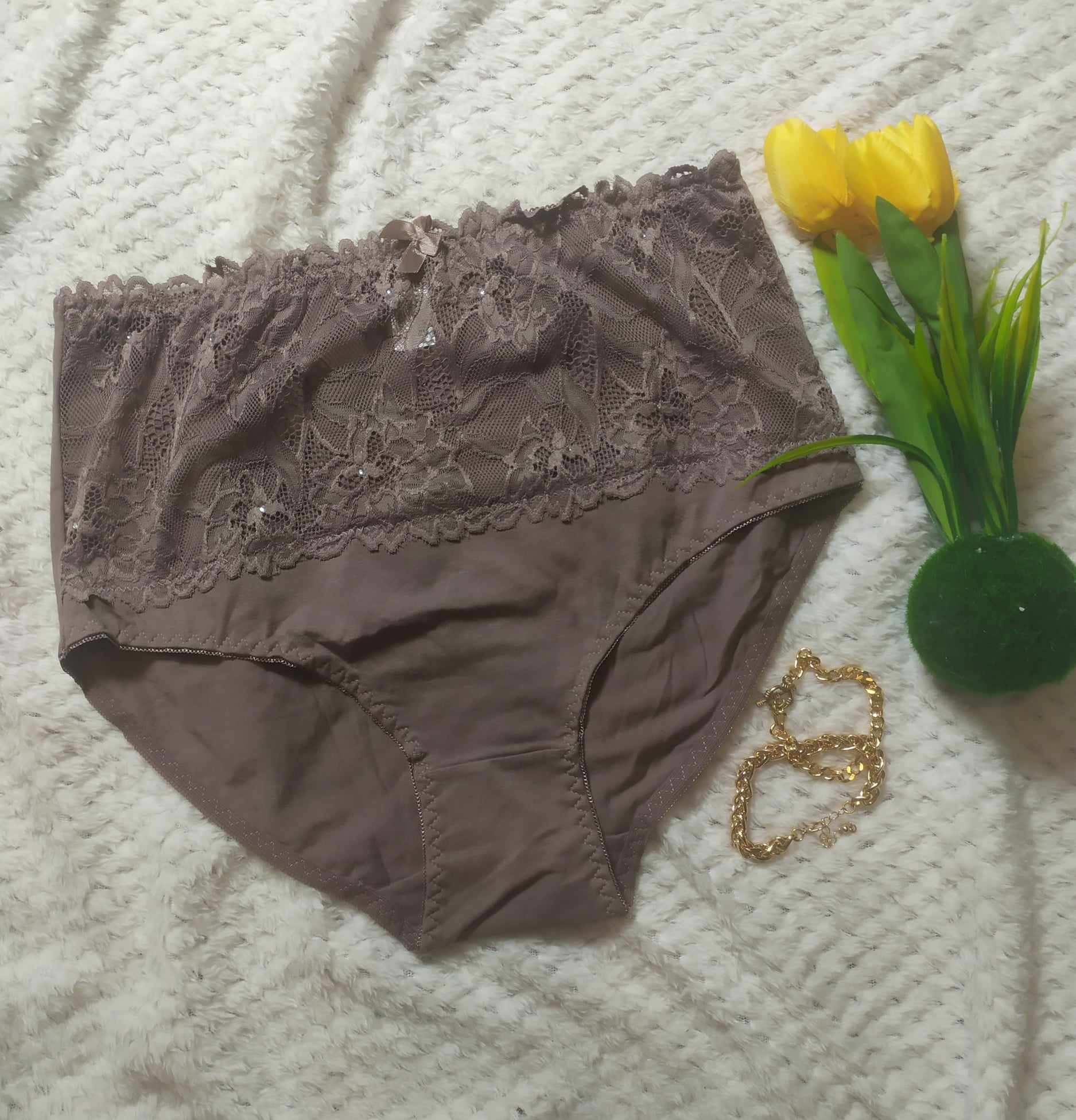 Proponujemy majtki bawełniane wykończone z przodu koronką. Mają one wysoki stan, który lekko przytrzynuje brzuch.