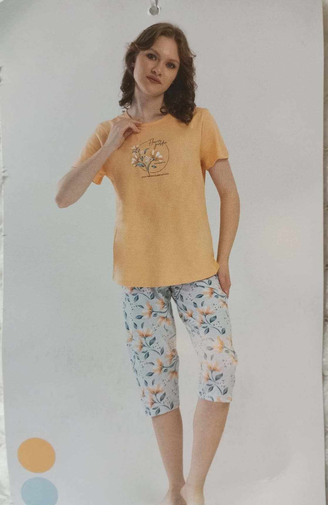 Oferujemy modną piżamę damską z krótkim rękawem i 3/4 spodniami. Jest dostępna w dużych rozmiarach. Wykonana z bardzo dobrej gatunkowo bawełny, dlatego materiał jest przyjemny dla skóry. Dobrze się pierze.