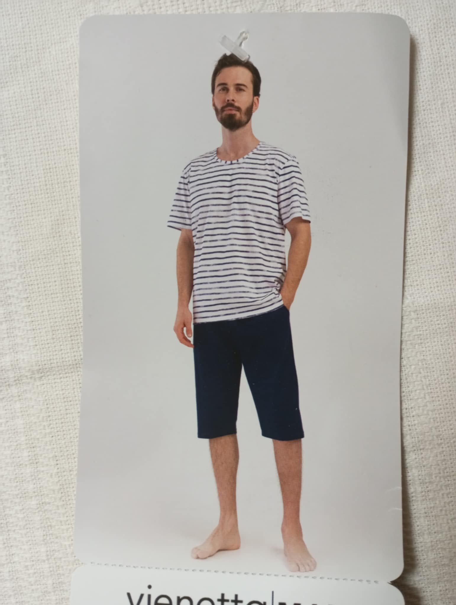 Piżama męska z bardzo dobrej bawełny. Bluzka jasna w granatowe paseczki. Spodenki do kolana , granatowe, gładkie. Idealna dla Panów ceniących wysoką jakość produktu, wygodę oraz komfort noszenia.