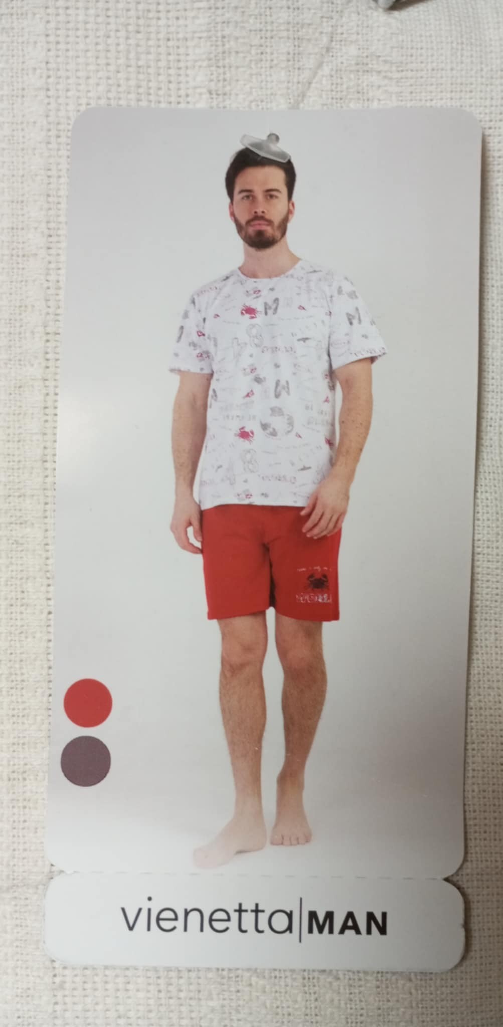 Piżama męska z bardzo dobrej bawełny. Bluzka jasna w zabawny, kolorowy wzór. Spodenki krótkie, bordowe z delikatnym nadrukiem. Idealna dla Panów ceniących wysoką jakość produktu, wygodę oraz komfort noszenia.