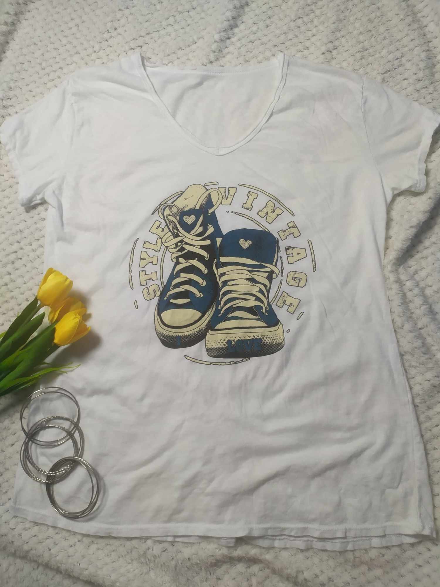 Oferujemy sportową bluzkę wykonaną z bawełny. Dekolt jest w kształcie serek. Przód ozdobiony wzorem z motywem trampek.
